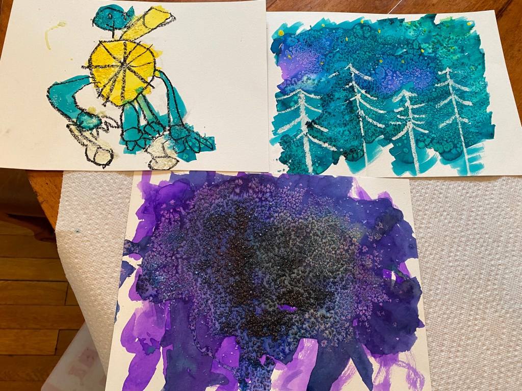 One of our contributors, Wendy, and her kids aged 2 and 5 years experimented with the Tinker Tuesday that was posted today. The project which used watercolors and salt was is a great way introduce ideas like hygroscopicity, absorption, and texture. While results varied based on approach, a fun time was had by all!